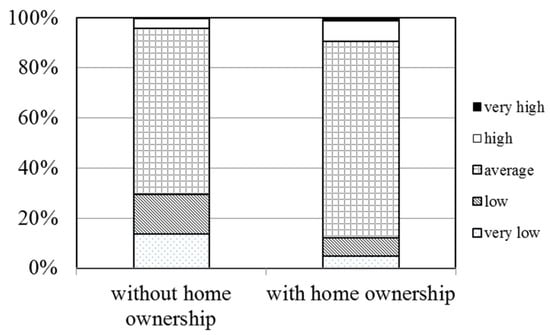 Income, home ownership, and education have a positive influence on SES, with total effects of 0.166, 0.193, and 0.078, respectively. In addition to income and education, our results indicate that home ownership also has a causal relationship with SES. The OR of a person with high SES owning a house was 12.3 times higher than one with a very low SES. Some 30.9% of respondents who did not own their homes declared low or very low SES, whereas less than 10% of respondents who did own their homes declared low or very low SES (Figure 5). Home ownership play a significant role in SES, and housing reform has tended to increase social stratification rather than to reduce it.