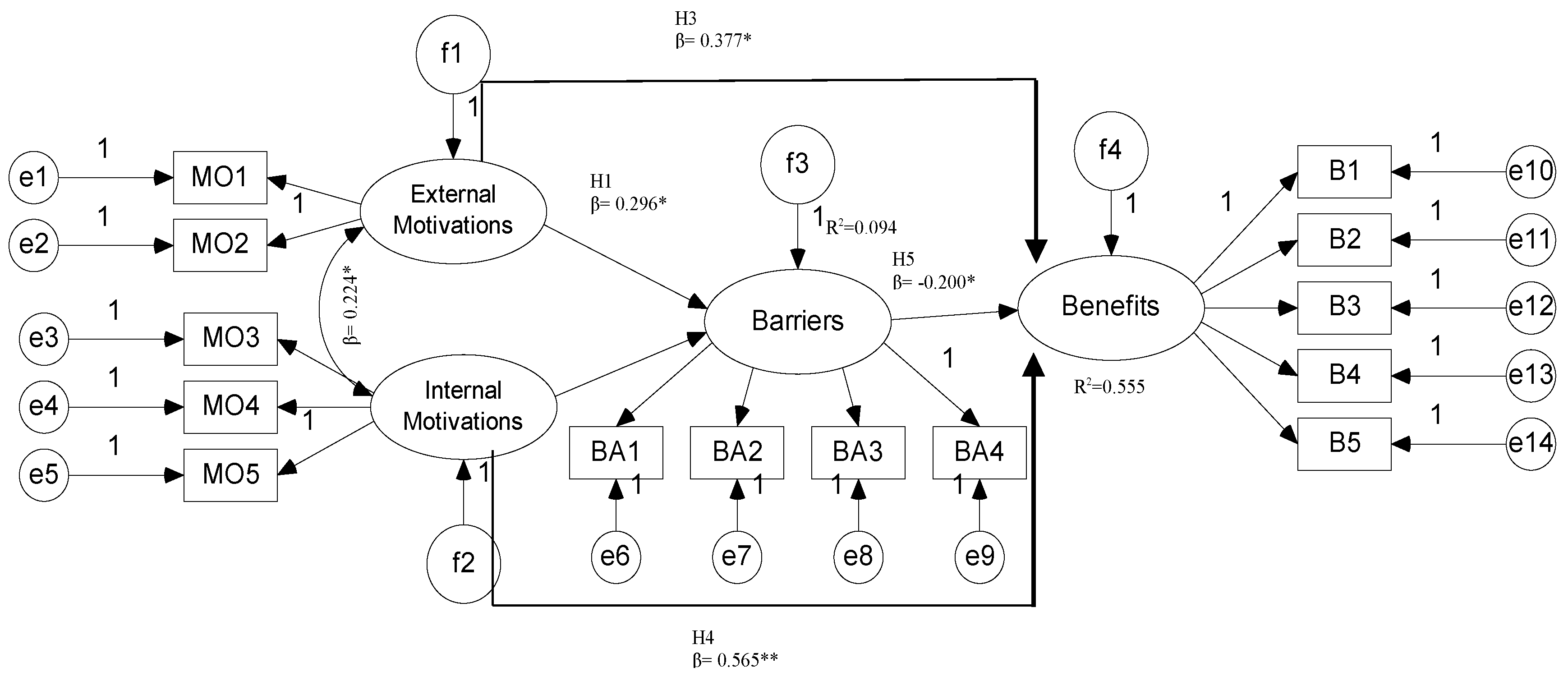 | Internal Motivations -- → Benefits | 0.565 ** | H4 corroborated |