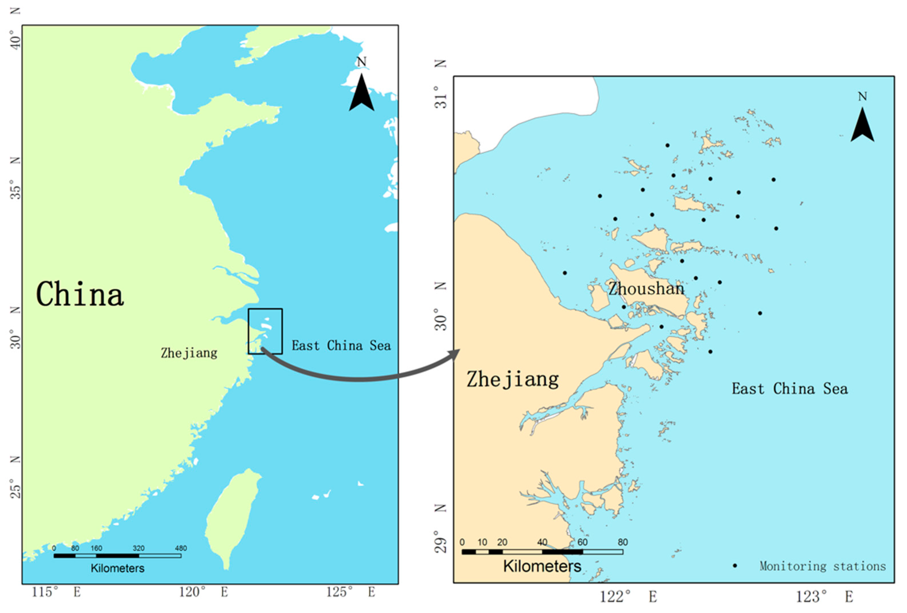 Figure 1. It mainly covers northern waters of Zhejiang Province, including the Zhoushan area. In situ real-time monitoring systems have been deployed in study areas to measure various water quality parameters. However, these online monitoring data cannot contribute to early, and thus timely, algal bloom warnings. Therefore, the data samples used for modeling are obtained from 20 monitoring stations in the coastal waters of Zhoushan where algal blooms are routinely monitored and are located in the northern waters of Zhejiang Province (