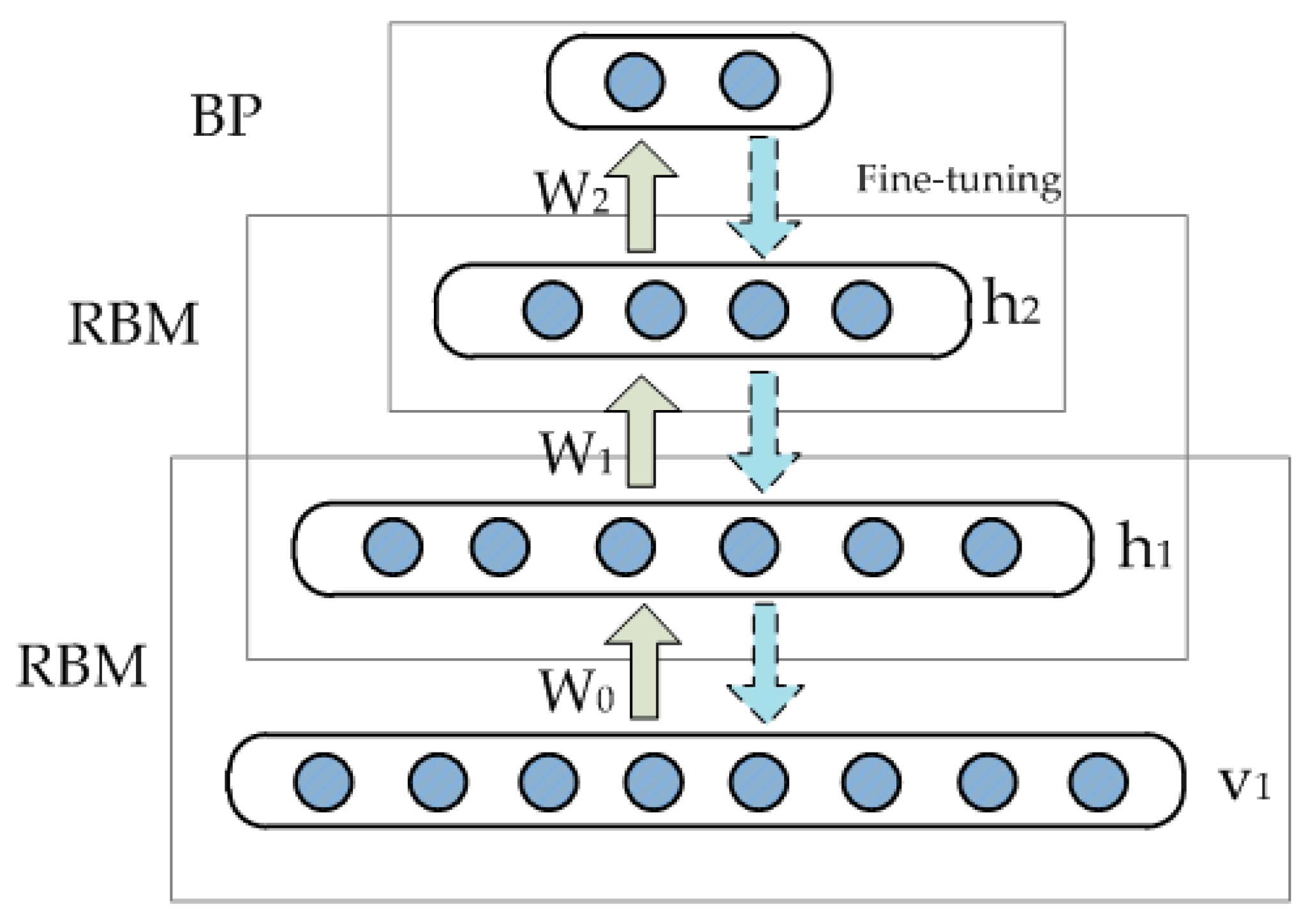 Figure 2). The visible layer is used to represent data from training samples, which is also known as the input layer. The hidden layer can be regarded as a feature classifier, extracting characteristic relationships between each dimension of the input data. Each unit, v, in the visible layer is connected to each unit, h, in the hidden layer in a symmetrical and bidirectional manner with weight, w, whereas units in the same layer have no connections. The aim of training the RBM is to minimize the total energy so that the probability distribution model can better match the observed data.