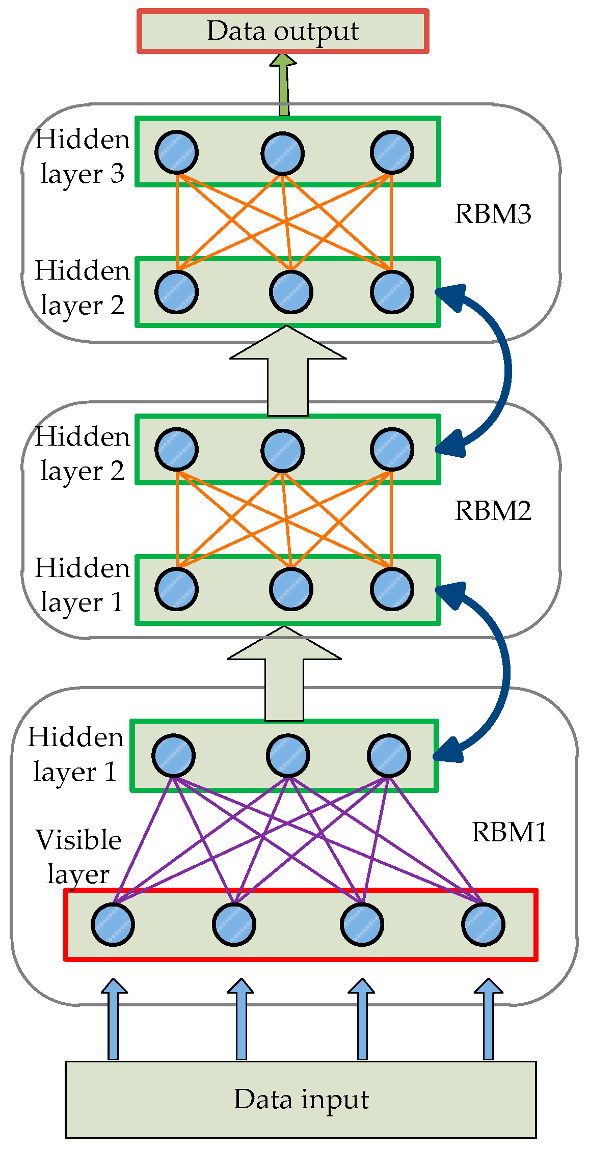 Figure 3. Each RBM extracts potential relationships behind the input data and the output of low-level RBMs is taken as the input data of high-level RBMs. A major concern is to identify a method to train the DBN effectively. In this study, the greedy layer-wise learning algorithm proposed by Hinton is adopted [