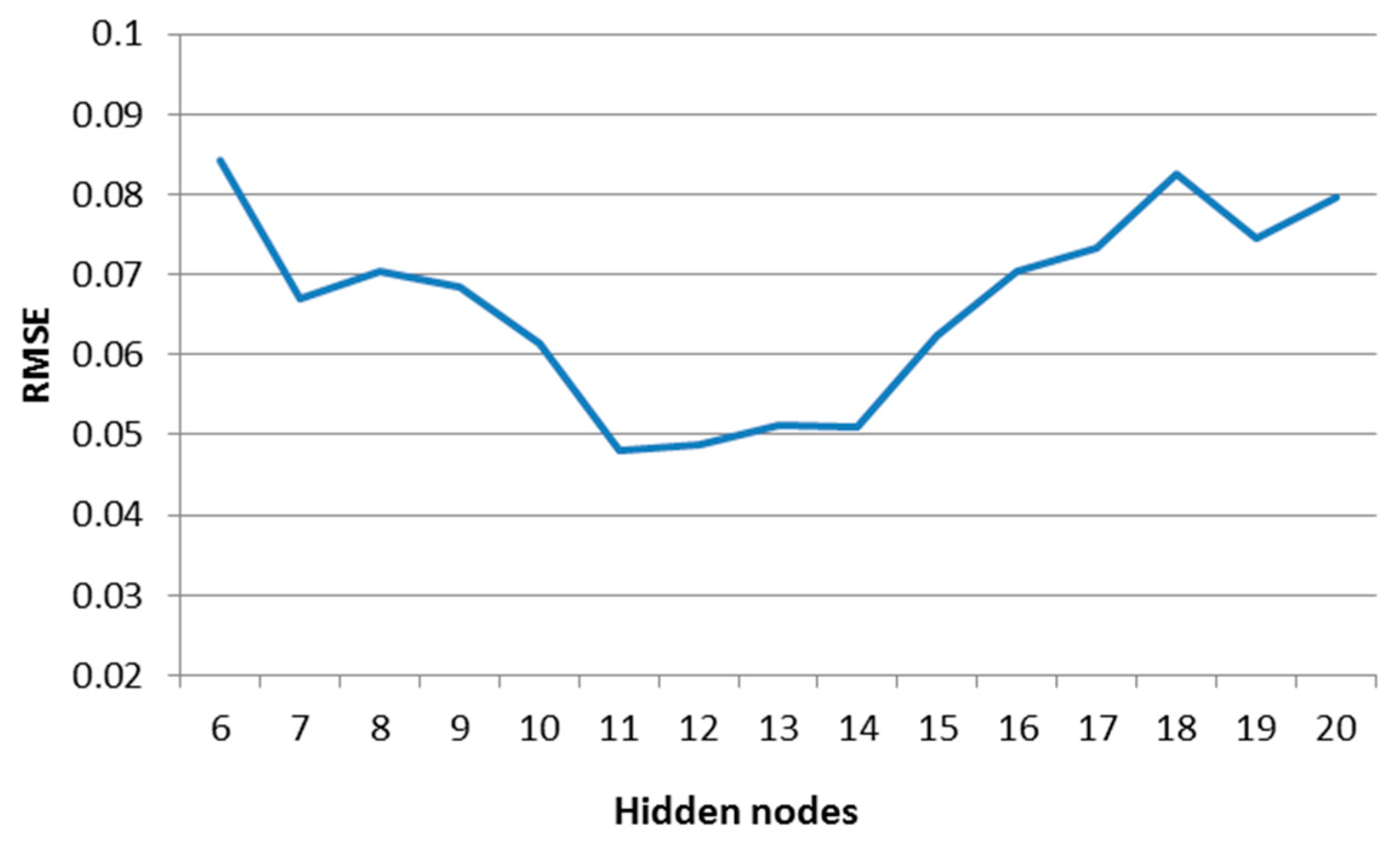 In this study, three popular criteria are used to evaluate the performance of the proposed model. These are the root mean square error (RMSE) and mean relative error (MRE). The selection of model parameters is related considerably to the performance of prediction, which includes the number of hidden nodes and the learning rate of the RBM. The number of hidden nodes is a critical parameter to the prediction model as too few hidden nodes may not possess sufficient ability to extract latent relationships between the density of phytoplankton cells and various environmental parameters, whereas too many hidden nodes will result in overfitting and poor prediction performance. However, no existing theory can calculate the aforementioned parameters. Therefore, selecting the optimal architecture of DBN remains to be a difficult task. In this study, the number of hidden nodes is selected based on trial and error in terms of RMSE, as well as the learning rate and iteration number. However, due to the limitation of time and energy, the number of input nodes is selected as 12, which is the same as the number of parameters used in the model.