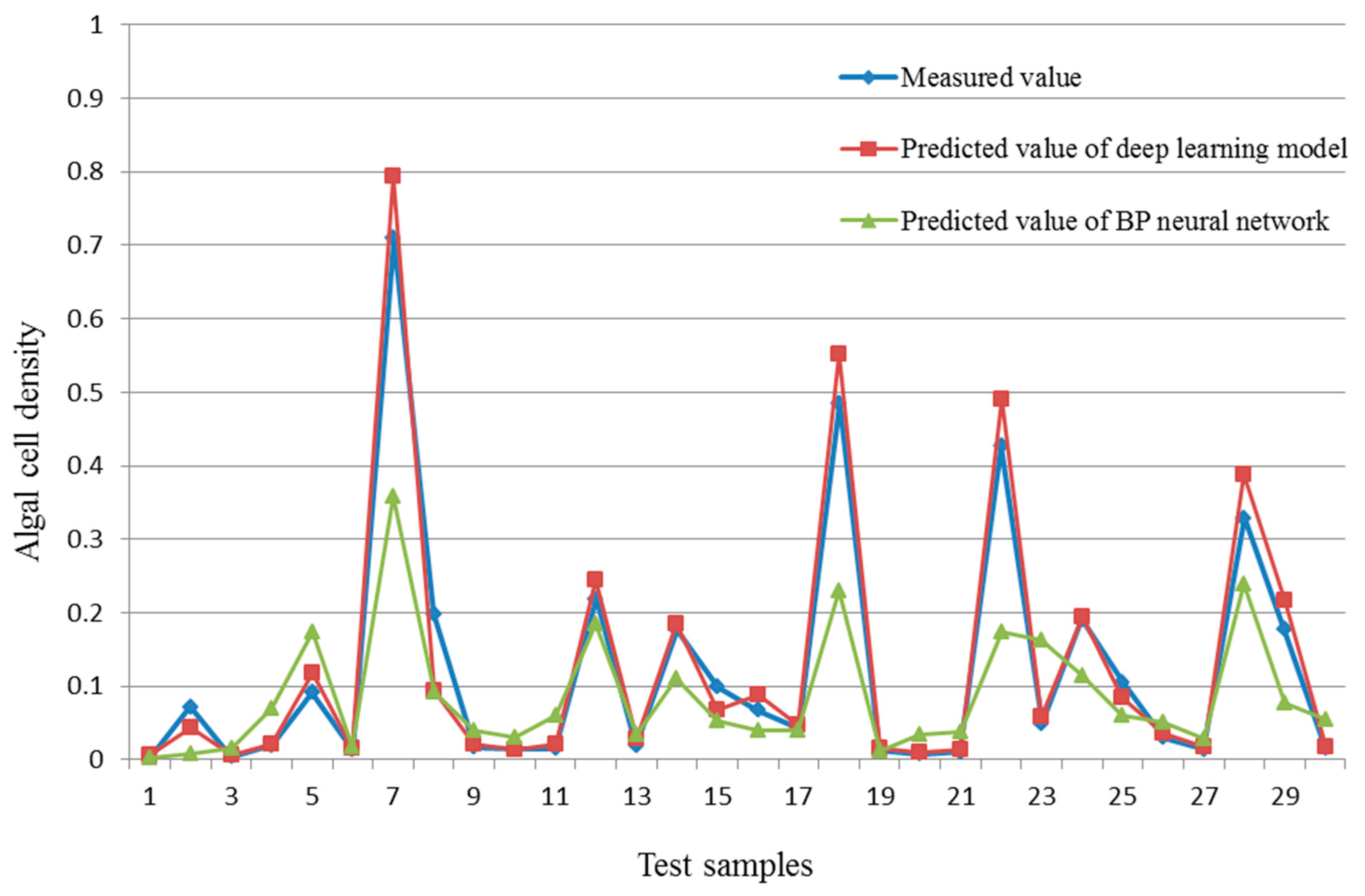 Figure 7. The predicted values of the deep learning model are clearly nearer to the measured values of phytoplankton density than those of the BP neural network. The predicted values of the deep learning model show high consistency with the real values, whereas the forecast results of the BP neural network are quite different to the actual values at some points. In particular, the crest value prediction accuracy of the deep learning model is considerably superior to that of the BP neural network. For example, at the seventh test sample, the predicted value of the deep learning model is 0.7941, which is closer to the measured value (0.7094) than the predicted value of the BP neural network (0.3586).