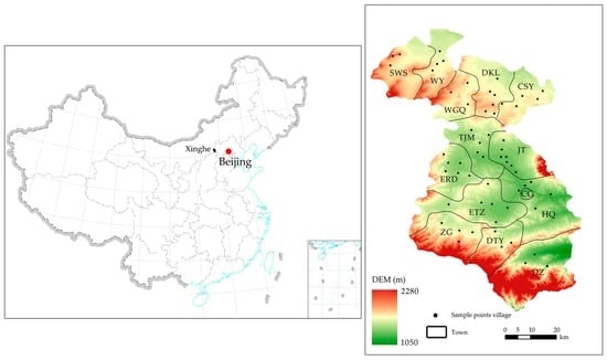 The location of Xinghe in China and the distribution of field observation in 14 towns. DEM is an abbreviation of digital elevation model. Land elevation ranges from 1050 to 2280 m in Xinghe.