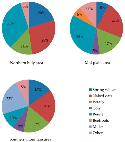 Crop diversification is a drought risk management strategy. In Xinghe, the lack of household savings and agricultural insurance means that farmers are unable to smooth out consumption through ex post mechanisms. Therefore, they can allocate household resources to secure a more stable income through diversifying farm or non-farm activities. This could be interpreted as drought risk management—a deliberate ex ante strategy towards anticipating possible negative events and counteracting expected failures in various income streams in the future. For instance, based on the water demand for the varieties of different crops in the growing season, local farmers often adopt highly diversified crop planting strategies to reduce weather-related risks [8,25,26], as Makate et al. pointed out that crop diversification is a viable climate-smart agriculture practice that significantly enhances crop productivity and consequently resilience in rural smallholder farming systems [26]. Figure 2 shows that, in order to reduce drought risk, many local rural households in Xinghe divide their land holdings into several plots for different crops, such as spring wheat, naked oats, and potato, since the sensitivity of different crops on the environment is different. It can be concluded that mixed planting leads to diversified income sources for rural households. The seasonal use of labor in rural areas is very important for income diversification. Seasonal laborers working as wage laborers in urban areas are an important source of income for rural households. Non-farm activities could absorb surplus labor, help farm-based households spread risk, offer more remunerative activities to supplement or replace farm income, offer income potential during the agricultural off-season, and provide a means to cope with or survive crop failures caused by droughts. As Table 2 suggests, 155 out of the 291 surveyed rural households have family members working as migrant workers in urban areas.
