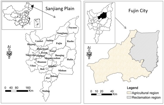 This work was conducted in the Sanjiang Plain, mainly in Fujin City (46°45′15″–47°37′25″ N, 131°25′33″–133°26′58″ E). Fujin is located in the north of Heilongjiang Province, covering an area of 8227 km2. The agricultural region (about 4907 km2) encompasses 11 towns and 266 villages while the reclamation region (about 3320 km2) includes three state farms and part of the Hongxinglong farm. Fujin (Figure 1) is located on an alluvial plain deposited by several major rivers (the Naoli River, the Qixing River, and the Songhua River). The average annual precipitation is about 547.8 mm. The average annual temperature is 21.2 °C and the warmest month is July, with a maximum average temperature of 27.6 °C, while the minimum average temperature is −19.3 °C in January. Fujin is rich in surface water as well as transportation networks. In recent years, Fujin accelerated the transformation of low-yielding fields and promoted contiguous high standard grain construction, leading to profound changes of land use patterns.