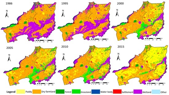 This study reports that paddy fields became the dominant landscape instead of dry farmland, and that large differences existed between two administrative regions. The basic conclusion is consistent with the study of Du et al. [24]. We also found that long time series and the use of several time intervals data can better describe the evolution progress. For example, both of these two studies showed that the overall trend of LPI and mean area declines in the agricultural region after 2000. However, our study find that these two indices increase first, before they decline. This is mainly because the transition rate from dry farmland to other land exceeded transition from other land to dry farmland in a certain year.