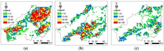 Spatial distribution of Pij (a) from dry farmland to paddy fields; (b) from wetland to dry farmland; (c) from wetland to paddy fields.