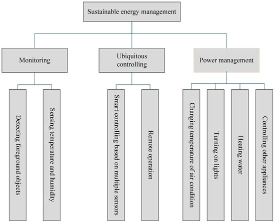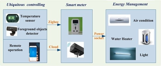 In the sustainable energy-saving strategies, smart meters provide an effective power reduction support by controlling electricity with intelligent functions [1]. Figure 1 shows the architecture of a sustainable energy management system consisting of three modules, which are monitoring, ubiquitous controlling, and power management. The monitoring module aims to sense the environmental information, including temperature, humidity, foreground objects, and other datasets. These sensing datasets are converted into several condition variables for evaluating an environment situation, which are then transmitted to smart meters via a low-cost and wireless sensor network based on ZigBee communication protocol [2]. Based on the received condition variables, the ubiquitous controlling module achieves an auto-controlling approach for energy management using smart meters. Meanwhile, the smart meters enable remote operation of switching and setting values through cloud computing and controlling. In the power management module, the power socket of an appliance is linked with a smart meter, whose controlling signals are able to control the connected appliance, such as changing temperature of air condition, turning on or turning off lights, heating water, and other activities.