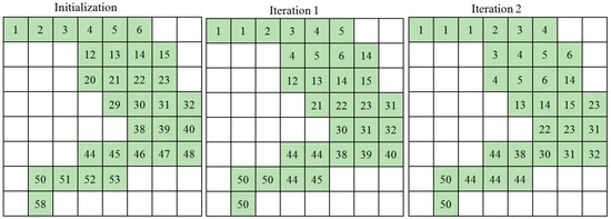 In contrast to these state-of-the-art sequential CCL methods, parallelism and multithreading strategies accelerated the labeling speed in high-resolution videos. Typically, there were two propagation methods implemented in the CCL kernel, including directional pass and multi-way pass. Using CUDA, Kalentev et al. [36] and Hashmi et al. [37] implemented iterative row–column scanning on 2D binary grids. After initializing all non-zero element labels with their corresponding index, this algorithm propagated the lowest label value along the rows and the columns to label all non-zero neighbors with this lowest value. Hawick et al. [38] imaplemented and analyzed the performance of two-pass, one-pass, and multi-pass CCL algorithms for speeding up graph component labeling. They allocated a thread for each pixel, which propagated its adjacent pixel list and labeled them with the minimum label value of them. The propagation iterations were stopped and the labeling process was finished until all labels were not changed. In the directional propagation labeling algorithms, such as one-pass, two-pass, and row–column scanning, a GPU thread scanned a row and a column at least twice. The first scanning was to search minimum label, and the second scanning was to label all grids in the row and column with the minimum label. This scanning method was effective for low-resolution images. In contrast to CPU thread, the processing speed of GPU thread was reduced when the computation complexity became high. Thus, the row–column scanning algorithm of CCL caused computational overload for high-resolution situations. From their experiments, the multi-pass algorithms provided the best performance. In description of their multi-pass algorithms, each thread searched and labeled the corresponding local and neighbor pixels synchronously. Figure 2 shows an example of two iterations of their method. To keep synchronous reading and updating labels, a GPU thread executed its function and held on until every thread finished searching the minimum label. Also, a GPU thread only labeled the local pixel with the minimum label, instead of propagating the minimum label to its neighbor pixels. Although this method kept the consistency of the CCL results, a large number of iterations were required for large-scale datasets due to the low bandwidth of the labeling process.