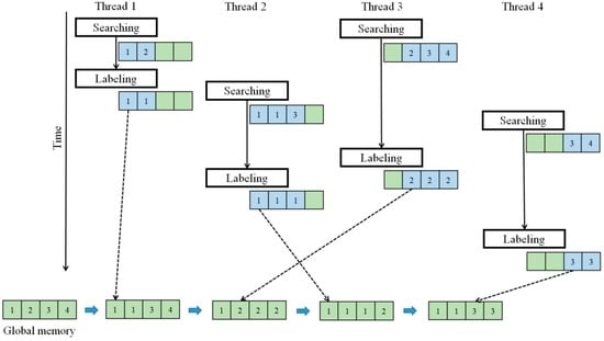 Using the threads synchronization function, the parallel computation speed was reduced, because the threads had to wait for all threads to finish. Meanwhile, the labeling process became slow without propagating the minimum label to neighbor pixels. If the GPU threads processed the neighbor propagation without synchronization, the data-dependent issue in Figure 3 would arise, because the GPU threads executed with different speeds. Taking the first four pixels as an example, the labeling process in thread 4 was slower than thread 2, so that the labeling result “1112” was covered by “1133”. This asynchronous characteristic of GPU threads caused uncertain iteration times.
