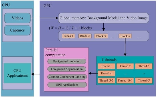 Currently, the traditional data analysis algorithms are enhanced using GPU technologies [22], which enable parallel computation of large-scale datasets. The compute unified device architecture (CUDA) from Nvidia (Nvidia, Santa Clara, CA, USA) provides GPU programming interfaces, which is widely studied for pixel-wise background modeling and foreground segmentation [23]. To extend the typical CPU-based GMM background modeling method [24], Pham et al. [25] and Boghdady et al. [26] utilized CUDA libraries to implement the background modeling process in parallel. They created a pixel-wise probability distribution of intensity, which was updated by each allocated pixel thread in parallel. To remove shadow effect under intensity changes, Fukui et al. [27] recorded illumination intensity and RGB (red, green, blue) color information into a histogram table as an adaptive background model. The intensity and color threshold of each pixel were generated from their distribution stored in the corresponding histogram. The histogram buffer was allocated and updated in GPU memory so as to record each pixel’s information in parallel. Although the background modeling and foreground segmenting processes were able to be implemented synchronously using these methods, noise and holes existed in the foreground segmentation results.