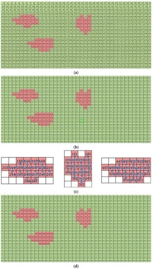 We illustrate the propagation in Figure 7c with d = 1. In the CPU-based sequential computing methods, the propagation process is implemented pixel by pixel. In contrast to them, we process all foreground pixels individually in parallel by H × W threads. Because a foreground pixel and its neighboring foreground pixels propagate to their neighboring cliques synchronously, the computation of local and the neighboring labels are not certainly finished. Thus, the labeling result is not always the same. When this parallel propagation process is executed iteratively until all label values no longer change, the connected pixels are labeled with the lowest label value among them after several iteration operations, as shown in Figure 7d.