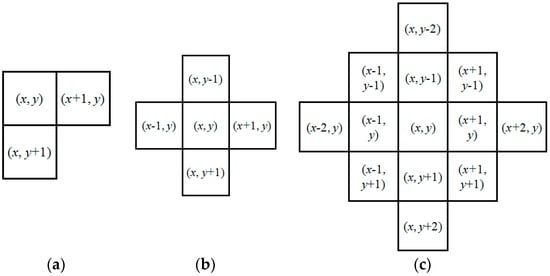 A label map L in Figure 7b is initialized from the foreground segmentation result. If a pixel i is classified as a foreground pixel, the label at i is specified as L(i) = i; otherwise L(i) = null. In the connectivity detection stage, each foreground pixel propagates to its adjacent foreground pixels which are labeled with the minimum label value among them. In the typically CCL algorithm, a pixel (x, y) propagates its right and bottom pixels, as shown in Figure 8a. In our proposed PCCL, we enlarge the propagation range for accelerating the convergence of the iterative scanning. As shown in Figure 8b,c, a neighboring clique for a pixel (x, y) is defined as the adjacent and local pixels to the pixel with a distance of d (d ≥ 1).