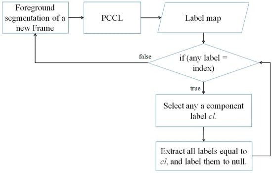 In contrast to CPU-based image processing methods, a GPU-accelerated framework for foreground CCL in video images is proposed as in Figure 4. The framework contains two modules, including foreground segmentation and labeling. Using CUDA software development kits (SDKs), we allocate (W × H − 1)/T + 1 blocks and T threads in each block in order to create W × H threads to compute the proposed image processing algorithms on each pixel in parallel. Here, W and H are the width and height of the video image separately.