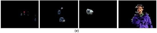 After several frames of background model updating, the background images in Figure 10b were generated from the color values located in the peaks of the color histograms. Then, we implemented the proposed PCCL algorithm in the foreground pixels segmented using the generated background model. The connected components were rendered with distinguished colors in the labeling results, shown in Figure 10c. After the components containing small quantity of pixels were removed as noise, the foreground segmentation results were refined and the foreground objects as large components were extracted, shown in Figure 10d. Finally, the foreground component pixels were extracted in Figure 10e by masking the binary map in Figure 10d to the original images.