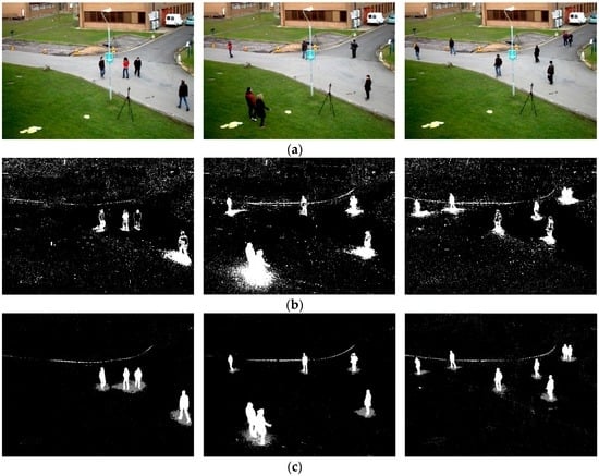 Figure 10 shows the experimental results of the proposed methods, which were executed on several typical and challenging scenarios from a crowd dataset (PETS2009) [40], vehicle dataset (AVSS2007, London, UK) [41], jug dataset (ICCV2003, Nice, France) [42], and WaveTree dataset (Microsoft Research, Redmond, WA, USA) [43], from left to right. In these datasets, the camera viewports were stationary. The crowd dataset contained a 768 × 576 AVI video for the evaluation of moving pedestrian detection. The vehicle dataset had 720 × 576 video sequences for the evaluation of vehicles segmentation, which contained parked vehicles. The jug dataset contained a set of 320 × 240 sequential images for evaluating the moving semitransparent jug segmentation from maritime environments where wave ripples existed. The WaveTree was a low-resolution dataset of 160 × 120 sequential images, which had a waving tree as a background object. The available buffer size of the applied NVIDIA hardware was 5622 megabytes, which satisfied the GPU memory requirement of the background modeling for our experiments.
