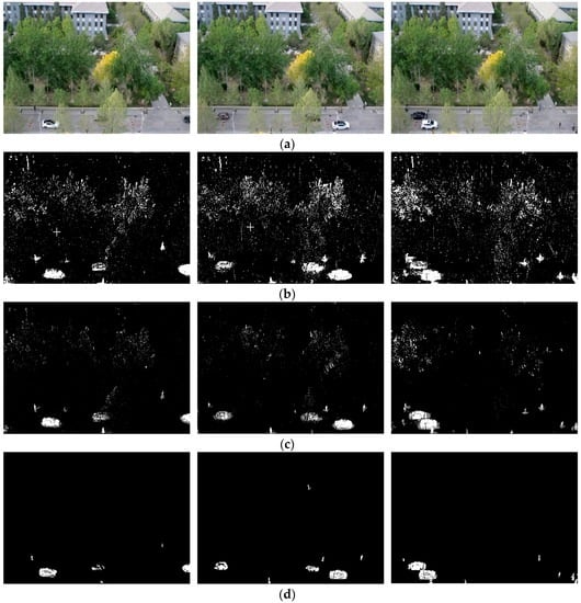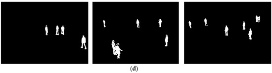 Figure 11 and Figure 12 illustrate the qualitative comparison results of these foreground segmentation methods on the 768 × 576 crowd dataset and 640 × 480 campus dataset, respectively. Figure 11a and Figure 12a have several sampling frames of the original videos. The foreground segmentation results using the codebook model are shown in Figure 11b and Figure 12b, which contained the noise caused by illumination changes and small waving objects. Although the GMM model removed the noisy spot caused by varying illumination, the spattered noise of waving objects still existed in the segmentation results, as shown in Figure 11c and Figure 12c. Using the PCCL algorithm, our proposed method removed both spot and spattered noise of a small quantity of pixels and provided accurate foreground detection results in Figure 11d and Figure 12d.