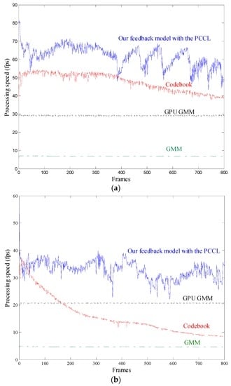 The foreground segmentation speed performances of the proposed feedback model with the PCCL, compared with the codebook, the GMM, and GPU GMM. (a) The dataset of 640 × 480 resolution; (b) the dataset of 768 × 576 resolution.