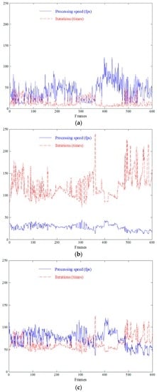Because the CPU thread scanned the video images pixel by pixel during each iteration, many labeling iterations were required so that the labeling speed was slow when the foreground pixels occupied large regions in high-resolution images. As shown in Figure 14a, the speed of the CPU-based CCL decreased faster when more propagating iterations were executed. The average labeling speed performance of the CPU-based method was 41.31 fps with 14.40 iterations. Approximately, if more than 29 iterations were executed, the labeling speed would be reduced to below 20 fps, which does not satisfy the real-time requirement.