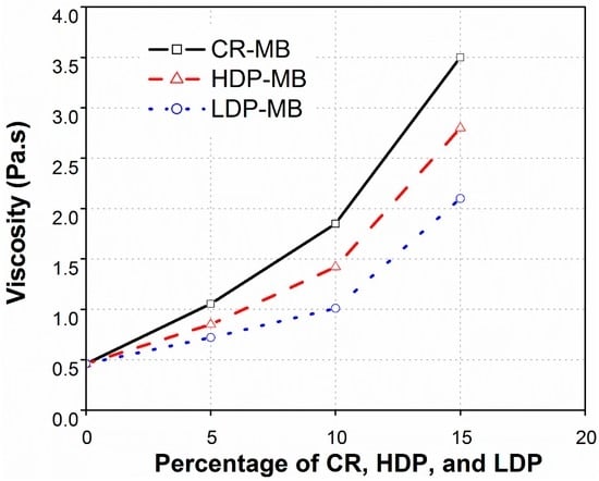 It is clear from the Figure 1 that the viscosity of binders increased with increasing percentages of LDP, HDP, and CR.