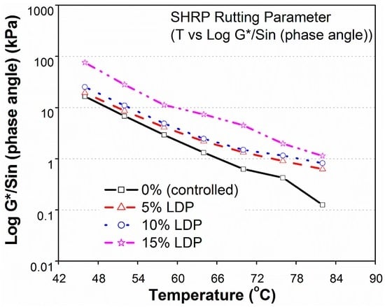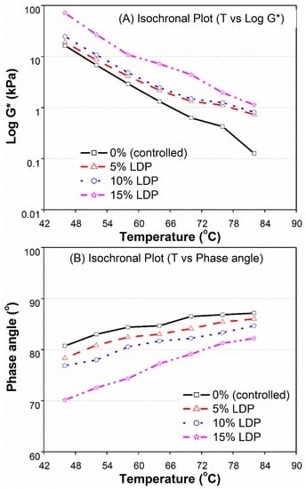 Relationships between temperature vs. complex modulus (G*) and temperature vs. phase angle (δ) are presented in Figure 2A,B for LDP-modified bitumen. It can be seen from the isochronal plot (Figure 2A) that the increase in percentage of LDP results in the improved value of G* as compared to the controlled bitumen, even at the highest temperature.