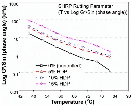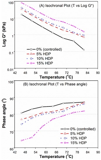 Relationships between temperature vs. complex modulus (G*) and temperature vs. phase angle (δ) are presented in Figure 3A,B for HDP-modified bitumen. It can be seen from the isochronal plot (Figure 2A) that the HDP-modified binder shows improved value of G* as compared to the controlled bitumen even at the highest temperature.