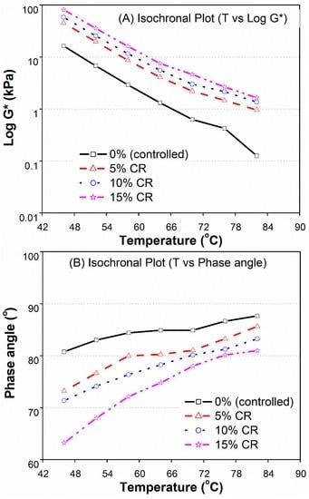 Relationships between temperature vs. complex modulus (G*) and temperature vs. phase angle (δ) are presented in Figure 4A,B for CR-modified bitumen. It can be seen from the isochronal plot (Figure 2A) that the CR-modified binder shows improved value of G* as compared to controlled bitumen even at the highest temperature.