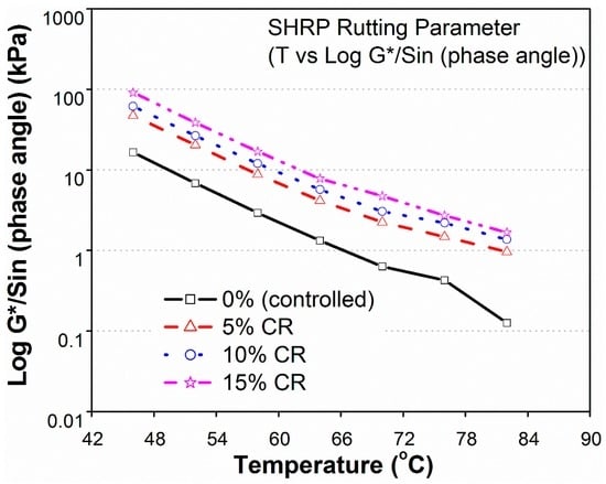 Figure 7 presents the relationship between the temperature and the rutting parameter (G*/Sinδ) for CR-modified bitumen (CR-MB). It can be concluded from the results that with an increasing percentage of CR, the binder resistance to rutting (permanent deformation) has also increased. At temperatures 64 °C and below, both CR-MB and the controlled binder meets the SuperPave minimum requirements (G*/Sinδ > 1 kPa).