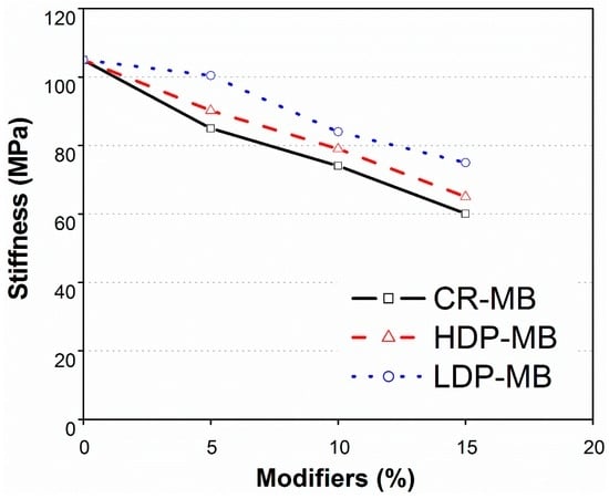 Furthermore, the tests were performed on the base binder and on the modified binders, which were aged in a rolling thin film oven (RTFO) and pressure aging vessel (PAV) prior to the test. From Figure 8, it can be concluded that the stiffness of binders is decreasing with an increase in the percentage of modifiers. This clearly reflects improvement in binder resistance against low temperature cracks. The stiffness of CR, HDP, and LDP modified binder at 60 s (AASHTO M320) are within the range of the SuperPave specifications.