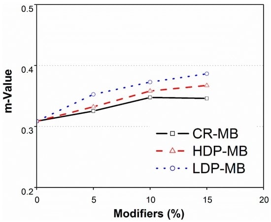 Rate of change in creep stiffness (m-value) at −10 °C for CR, HDP, and LDP modified binders.