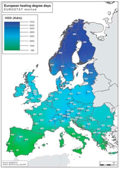European heating degree days (HDD), Eurostat method, provided by “Ecofys studies for Eurima” [10].