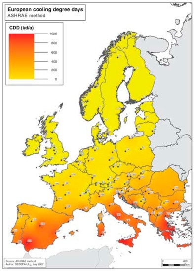 European cooling degree days (CDD), ASHRAE method, provided by “Ecofys studies for Eurima” [10].