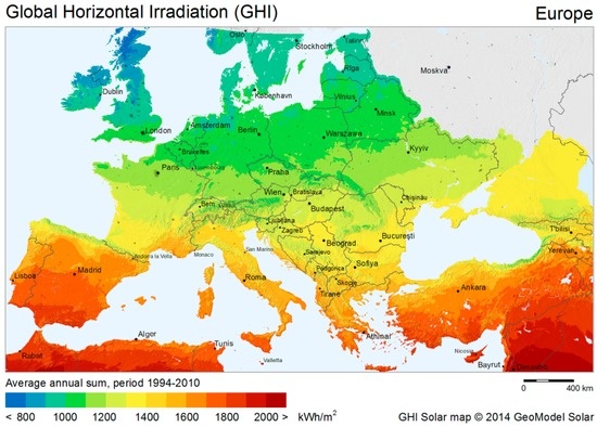 - Solargis. Global Horizontal Irradiation in Europe. Available online: http://solargis.com/assets/graphic/free-map/GHI/Solargis-Europe-GHI-solar-resource-map-en.png (accessed on 26 September 2016).