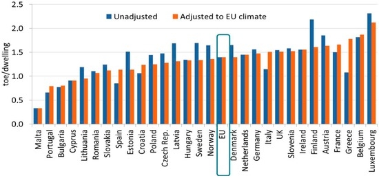 According to an analysis based on ODYSSEE and MURE databases [12], the comparison between countries is more relevant if the heating consumption is adjusted to the same climate, highlighting differences related to building characteristics and to type of uses and life style. After adjustment to the EU average climate, Figure 6 shows that Luxembourg and Belgium turn out to have the highest consumption, at around 2 toe/dwelling (i.e., 23,000 kWh), compared to 0.3 toe/dwelling (3500 kWh) in Malta or 0.8 toe/dwelling (9300 kWh) in Portugal and Bulgaria.