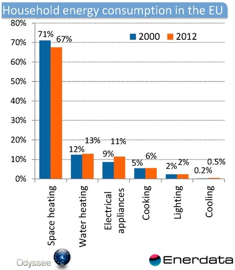 Space heating is the most important end-use in the residential sector in the EU (67% in 2012, according to Figure 7) but its share has been slightly declining.