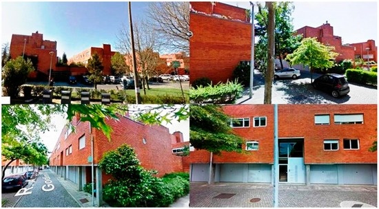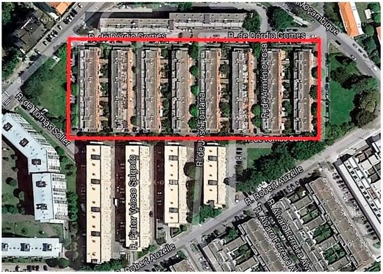 The object of the study was a set of buildings that constitutes the second phase of a wider complex, a neighborhood, promoted by a housing cooperative. The set of buildings under study (bordered by a red line in Figure 10) is a residential complex built in 1991 and designed by architect Manuel Correia Fernandes. It consists of eight buildings (numbered from A1 to A6 and B1 and B2), with 16 apartments each, in a total of 128 apartments distributed by typology, as shown in Table 2.