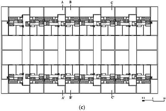 (a) Ground-floor; (b) First floor; and (c) Second floor plans.