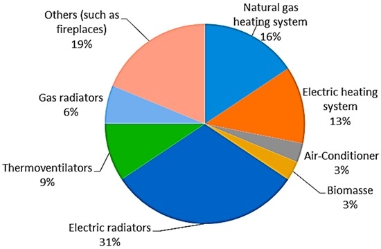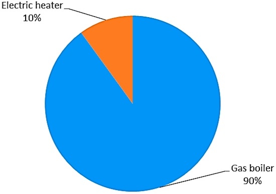 The energy matrix of the metropolitan area of Porto [14] presents, for the residential sector, in terms of final energy consumption, the following estimation for each type of use: space heating (22%); DHW (22%); domestic cold, i.e., fridges and freezers (17%); cooking (16%); appliances (16%); lighting (6%); and space cooling (1%). These are average figures and of course it is possible to find specific examples of different behaviors, depending on the building and especially on its use. However, an analysis of all the information gathered for the studied residential complex made it possible to accept this distribution as an average user profile, suitable for the purpose of the present preliminary study although certainly not enough accurate for a real intervention.