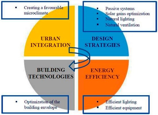The reduction of a building energy needs can be pursued through an adequate combination of four key points: urban integration (which defines the surrounding microclimate), design strategies (whose options influences the way the building interact with the climate), building technologies (sustainable and economical viable construction solutions must be chosen) and energy efficiency of all systems and equipment used in the building. Figure 18 represents this idea.