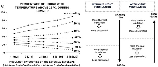 As seen in this case study, the actual savings obtained with the increase of thermal insulation are usually not very significant due to the climate and to low space heating habits. This means that this extra investment may expect a quite long payback period. In fact, a slight energy consumption reduction is not an argument convincing enough for the owners. Furthermore, if an extra insulation can bring some advantages in terms of thermal comfort in winter, this is not assured in summer for Mediterranean climate. A computer simulation study carried out on the influence of increasing thermal insulation on summer thermal comfort [17] showed there is a turning point where, depending on thermal inertia, ventilation and heat gains, an increase in thermal insulation leads to an increase of the number of hours of discomfort in summer. In the left side of Figure 19, an example of the variation of the percentage of hours of discomfort in summer, for a location in Portugal, in function of the level of insulation of the envelope is given for different values of the shading factor. If solar gains are high (non-existing or non-efficient shading), it can be observed that a high level of insulation may be harmful. An efficient night ventilation can reduce that effect as shown in the right side of Figure 19.