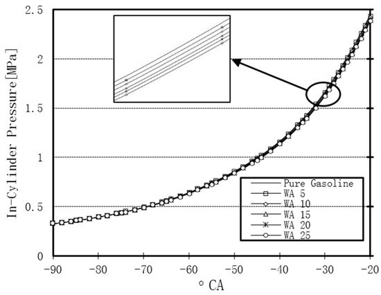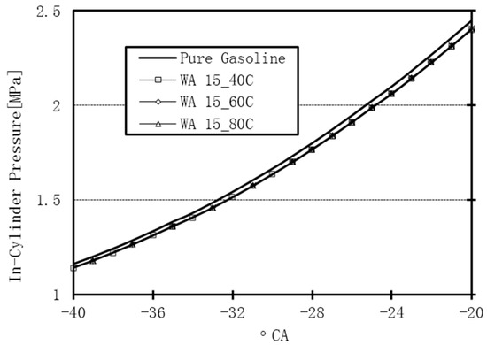 After the direct injection of water into the cylinder, the liquid water absorbed the heat of the compressed gas. During the first stage, injected water results in the cooling of the compressed charge. The temperature change under the effect of WI is indicated in Figure 4. The compressed gas temperature was decreased, leading to the decrease of the in-cylinder pressure. Figure 5 illustrates the decrease of the in-cylinder pressure during the latter stages of the compression stroke.