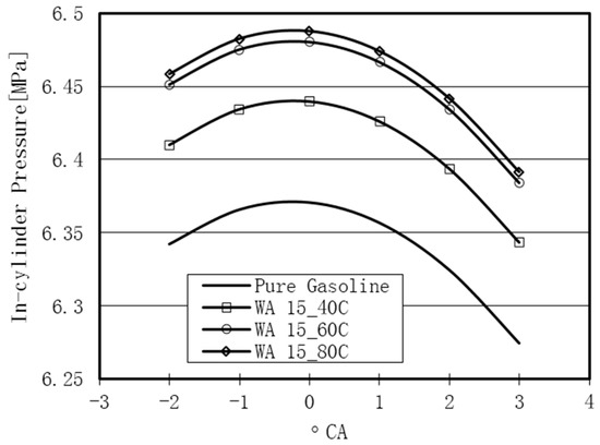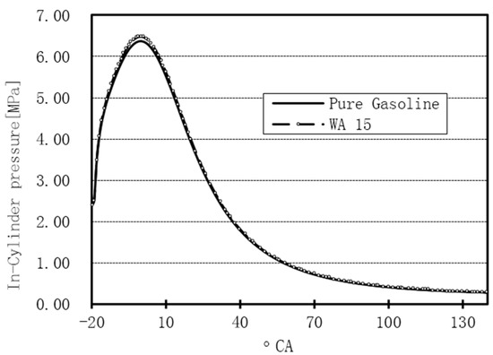 The in-cylinder pressure during the combustion-expansion process with the use of 15% WI in comparison with the pure gasoline case.