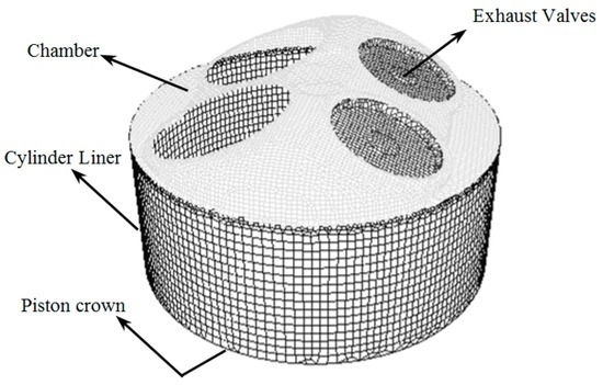 As previously stated, this paper used AVL-Fire for performing CFD simulation of the liquid water injection into the engine cylinder in an attempt to improve the in-cylinder pressure. The 3D geometrical shapes of the ICE were built using the Pro-Engineer software (Parametric Technology Corporation, Needham, MA, US). The computational domain was divided into three regions: the manifold intake region, the exhaust pipe region, and the piston-chamber region. It was necessary for the piston and valves to move according to the resolution of the crank angle and thus, the Fame Engine Plus module was used for generating the moving mesh. Figure 2 presents the engine model in the simulation domain.