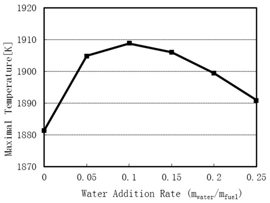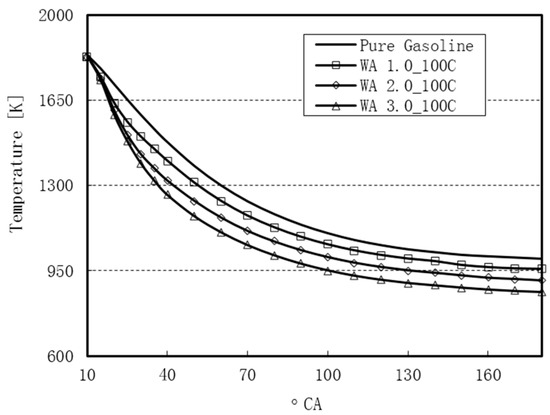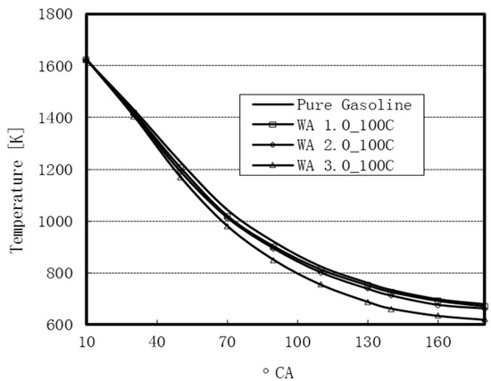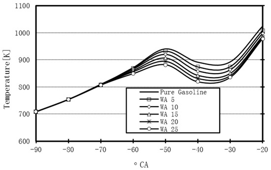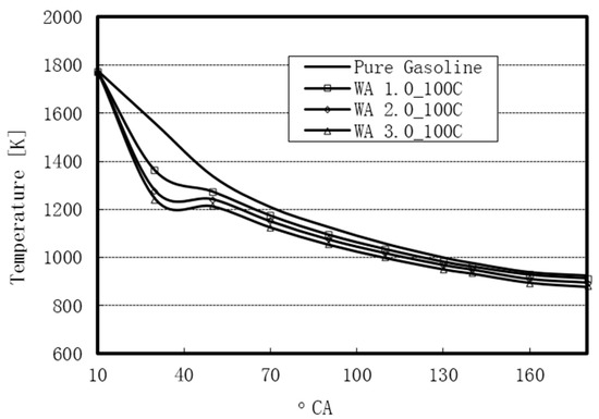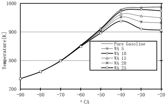 WI leads to the reduction in the local temperature of the combustion regions within the cylinder. However, the maximum temperature of the working gasses in the cylinder for the WA cases was higher than that for the use of pure gasoline. Figure 18 presents the maximum temperature values for the various WA rates and the use of pure gasoline. 15% of WA gave the highest peak-pressure and the highest average temperature.