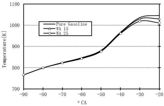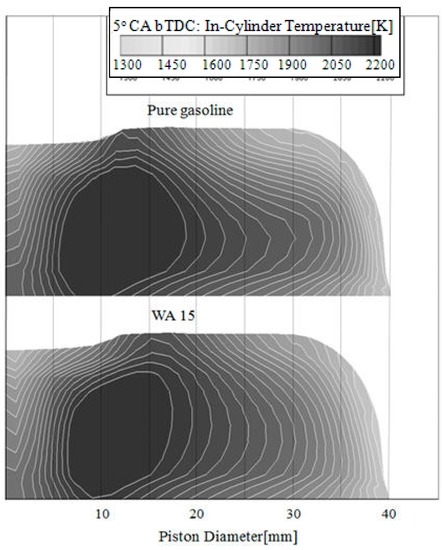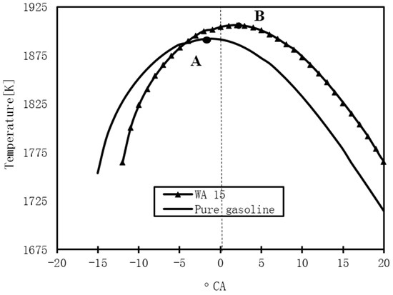 Figure 15 illustrates the maximum temperature point for 15% WA in comparison with pure gasoline. For 15% WA, the maximum temperature point moved around 3–5° CA in comparison with of the use of pure gasoline with the point B occurring after TDC (after 0° CA).