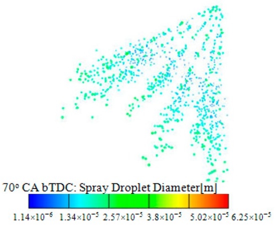 For Figure 9, Figure 10, Figure 11 and Figure 12, as the WI mass into the cylinder increases, the average surface temperature of the piston crown, cylinder liner, combustion chamber, and exhaust valves decreases. For 25% WI relative to the metered fuel mass and at 20° CA bTDC of ignition timing, the values of the decreasing average surface temperature were 46 K, 83 K, 35 K, and 20 K for the piston crown, cylinder liner, chamber, and exhaust valves, respectively. The decrease in the average surface temperature of the piston crown and cylinder liner occurs earlier and is lower than that of the combustion chamber and exhaust valves because of the direction of the injected water, which is directed toward the piston head as indicated in Figure 13.