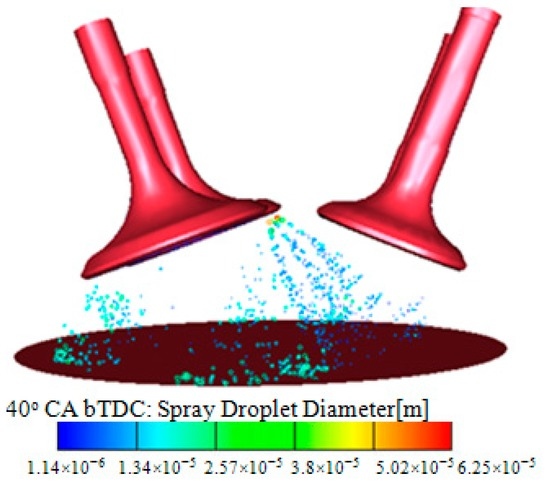 For the average surface temperature of the piston crown and cylinder liner, the quick decrease in the temperature value was realized at 40° CA bTDC, and was earlier than that of the combustion chamber and exhaust valves. This is because the fuel sprayed impinges the piston crown and the cylinder liner. Figure 14 illustrates the fuel spray cloud at 40° CA bTDC.