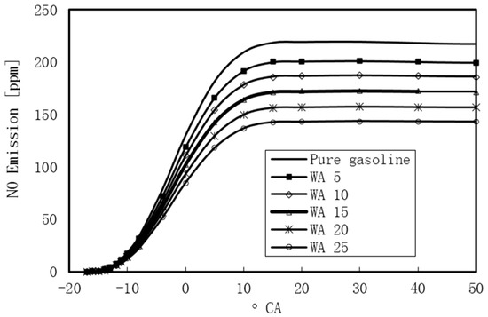 A major benefit of using WI in an engine is the reduction of NO emissions. In this study, the reduction of NO emissions was also achieved for WI during the compression stroke and is illustrated in Figure 16.