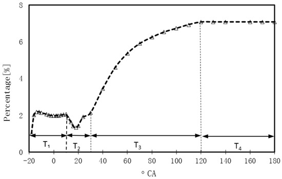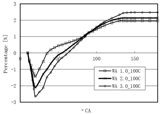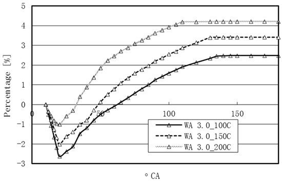 As the WA mass increased, there was a decrease in the in-cylinder pressure during the first stage. For WA 3.0, the percentage decrease of the in-cylinder pressure was 2.7%. During the second stage, the injected water vaporized and expanded in volume. The percentage increase in the in-cylinder pressure was positive during this period. In Figure 23, the area of the positive percentage increase in the in-cylinder pressure was larger than the area of the percentage decrease in the in-cylinder pressure. Thus, the effect of WI on improving the power output can be achieved by the increase of the expansion pressure during the power stroke.